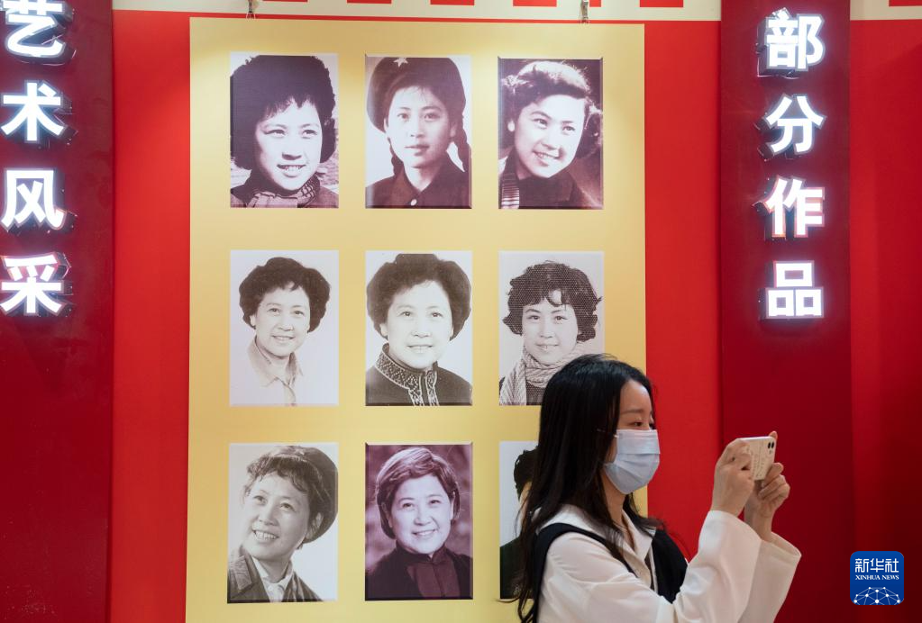 5月19日,老艺术家郭兰英(左二)在第六届中国文联知名老艺术家艺术成就展上观展。
