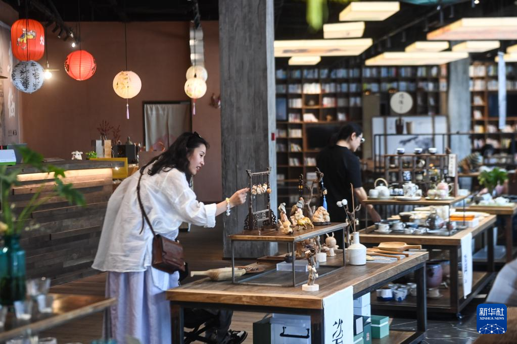 在位于杭州临安吴越文化公园的“地道吴越”民间手工艺文化空间内,顾客在挑选特色手工艺制品(5月14日摄)。该文化空间集临安非遗、临安民艺、文创研学、休闲体验为一体,近百件临安民艺产品在这里汇集。