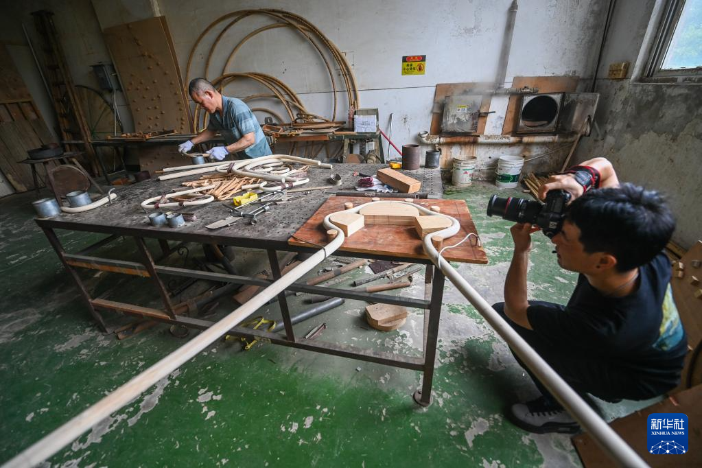 在位于杭州拱墅区的杭州昌盛藤器厂内,自然造物文化创意团队的工作人员在记录工人手工加工藤器的过程(6月7日摄)。这个厂生产的传统藤编制品通过自然造物文化创意团队在多地的民间手工艺文化空间进行展示推广。