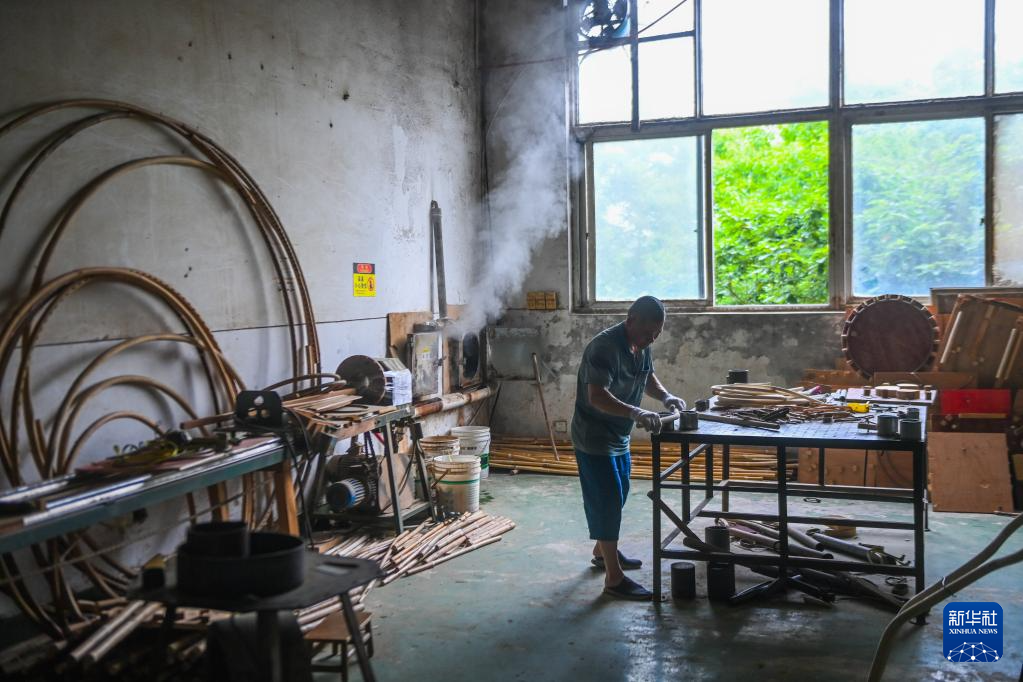 在位于杭州拱墅区的杭州昌盛藤器厂内,工人正在手工加工藤条,通过热弯塑形制作传统藤器(6月7日摄)。这个厂生产的传统藤编制品通过自然造物文化创意团队在多地的民间手工艺文化空间进行展示推广。