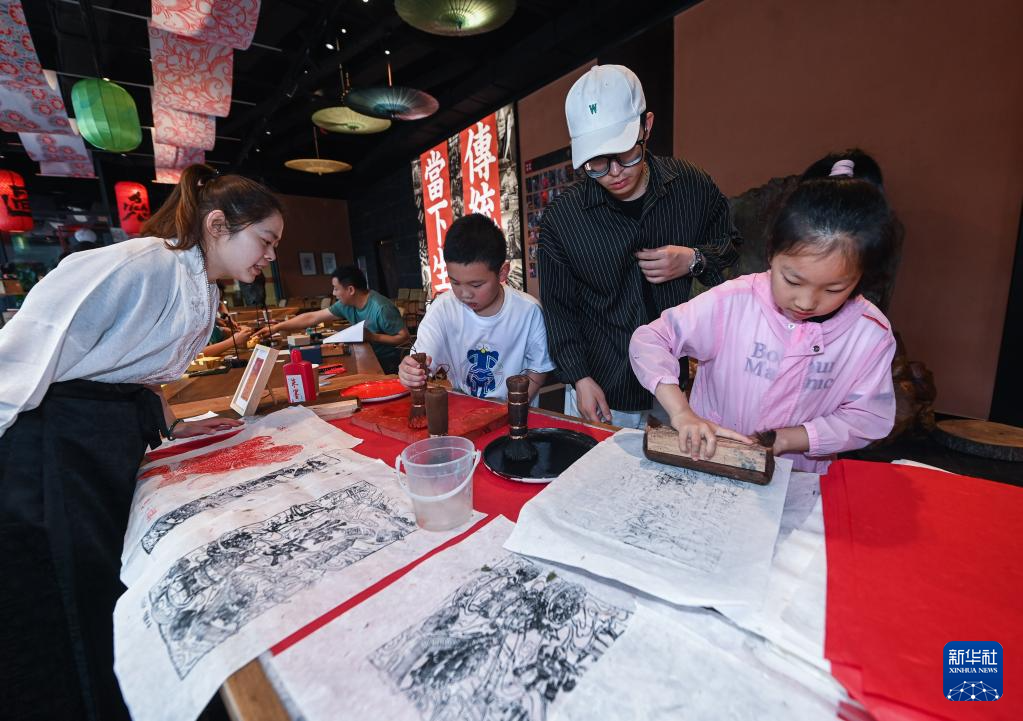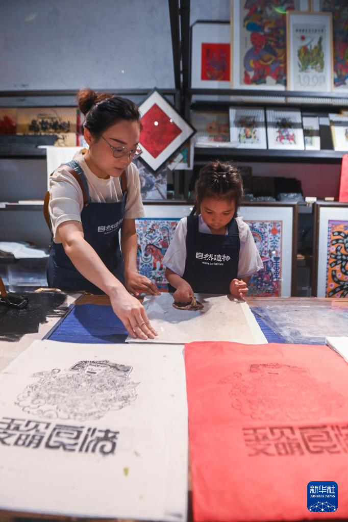 在位于杭州瓶窑老街的自然造物民艺研究中心内,工作人员带着孩子们在体验木版年画拓印技艺(5月28日摄)。该中心是占地3500多平方米的民间手工艺文化空间,集中展示来自全国二十多个省份数千种手工艺产品。顾客也可以在这里体验包括木版年画拓印、泥塑彩绘、油纸伞制作、竹编灯笼、刺绣等非遗技艺。