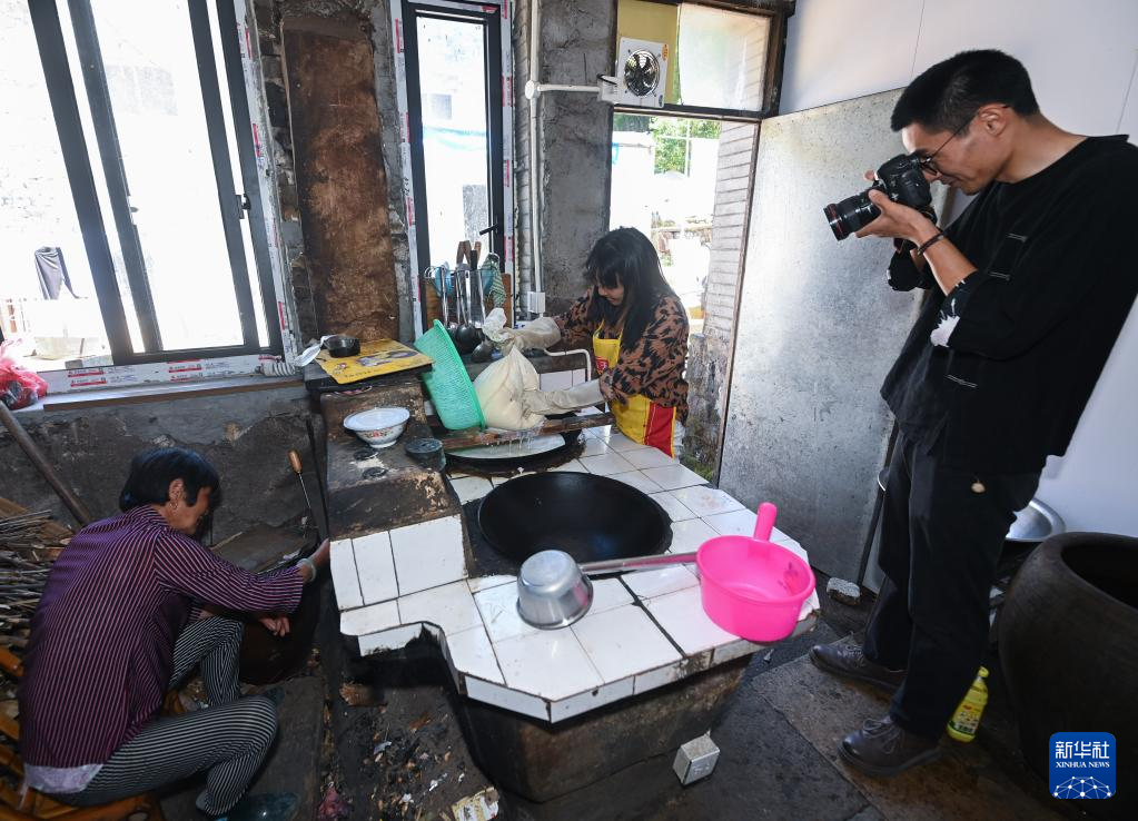 自然造物文化创意团队的工作人员在浙江省台州市黄岩区屿头乡布袋坑村拍摄记录当地百姓制作传统豆制品,这也是对外推介乡村农特产品的重要环节之一(5月30日摄)。