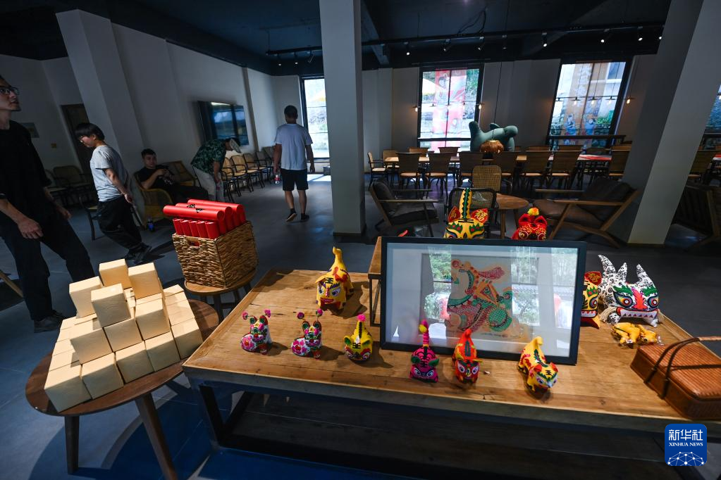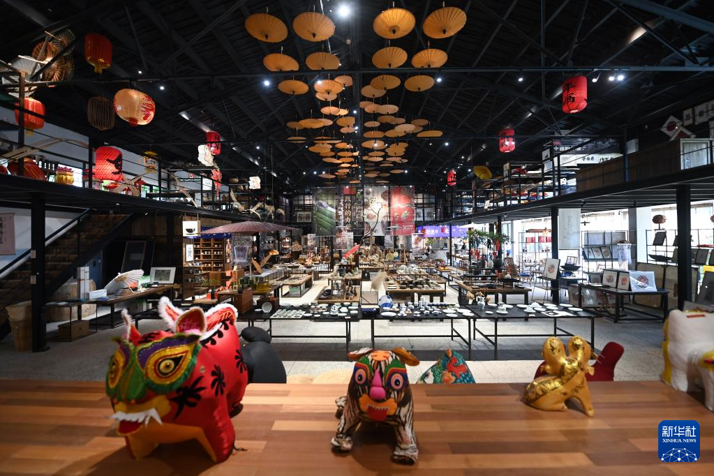 杭州瓶窑老街的自然造物民艺研究中心作为占地3500多平方米的民间手工艺文化空间,集中展示来自全国二十多个省份数千种手工艺产品。顾客也可以在这里体验包括木版年画拓印、泥塑彩绘、油纸伞制作、竹编灯笼、刺绣等非遗技艺(5月28日摄)。