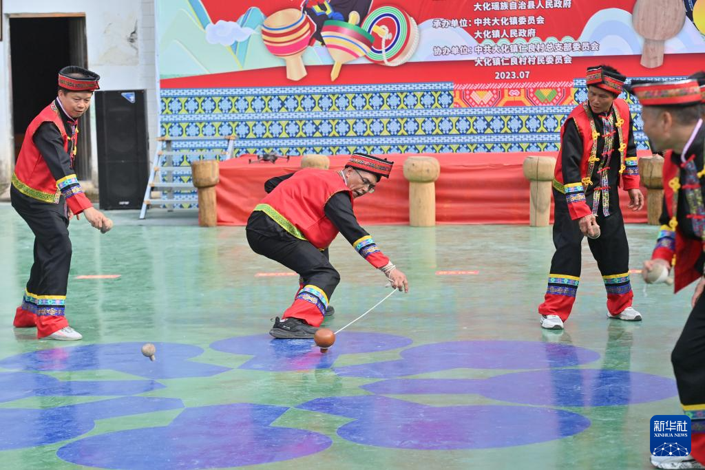 7月11日,在大化瑶族自治县仁良村,村民在陀螺文化展演活动中跳陀螺舞。