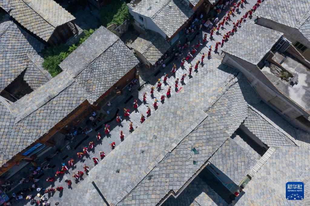 7月15日,地戏艺人在贵州省安顺市西秀区旧州镇开展地戏巡游(无人机照片)。