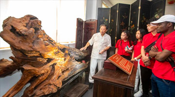 7月15日,河北涿州蒲氏蛋雕非遗传承人蒲德荣(右三)为学生讲解蛋雕制作技艺。