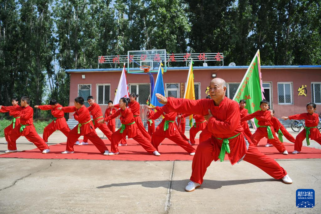 7月16日,传统武术望海庄少林会非遗传承人杨守培(前)在河北省涿州市刁窝镇望海庄村指导学生练习武术动作。