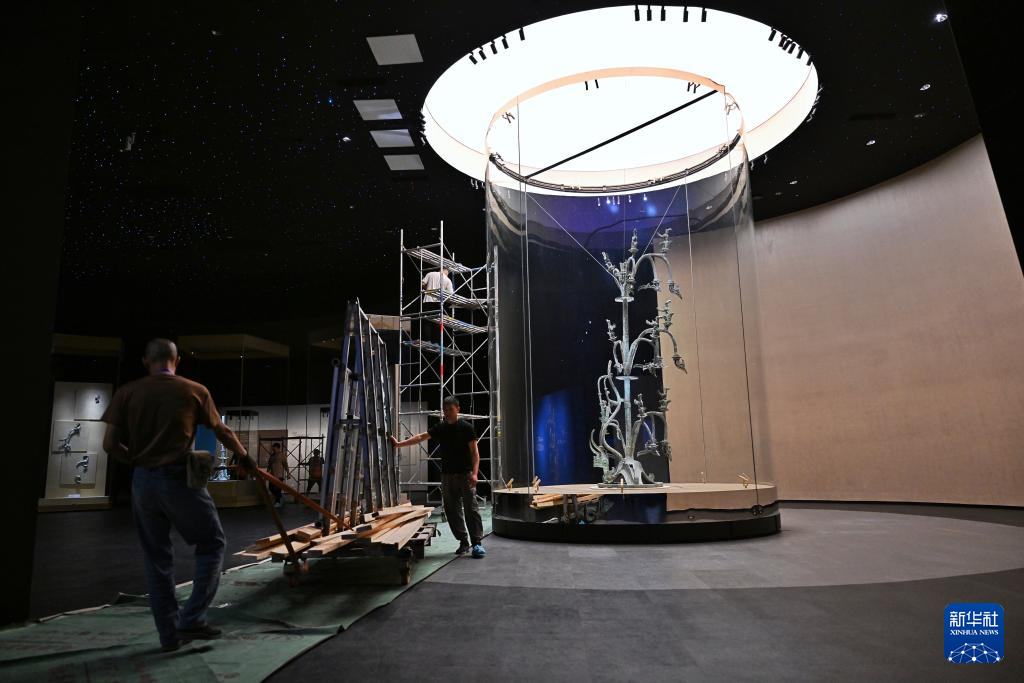 7月26日,工作人员在三星堆博物馆新馆内布展。