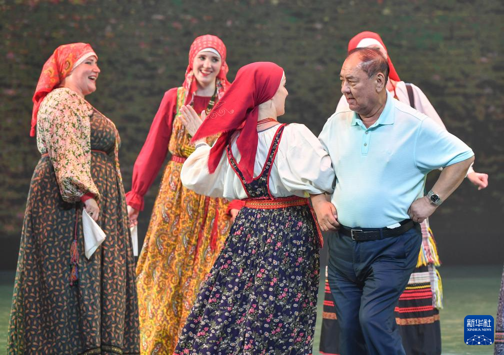 在乌鲁木齐晚报剧院,俄罗斯萨拉托夫州曙光歌舞团的演员邀请现场观众同台共舞(7月22日摄)。