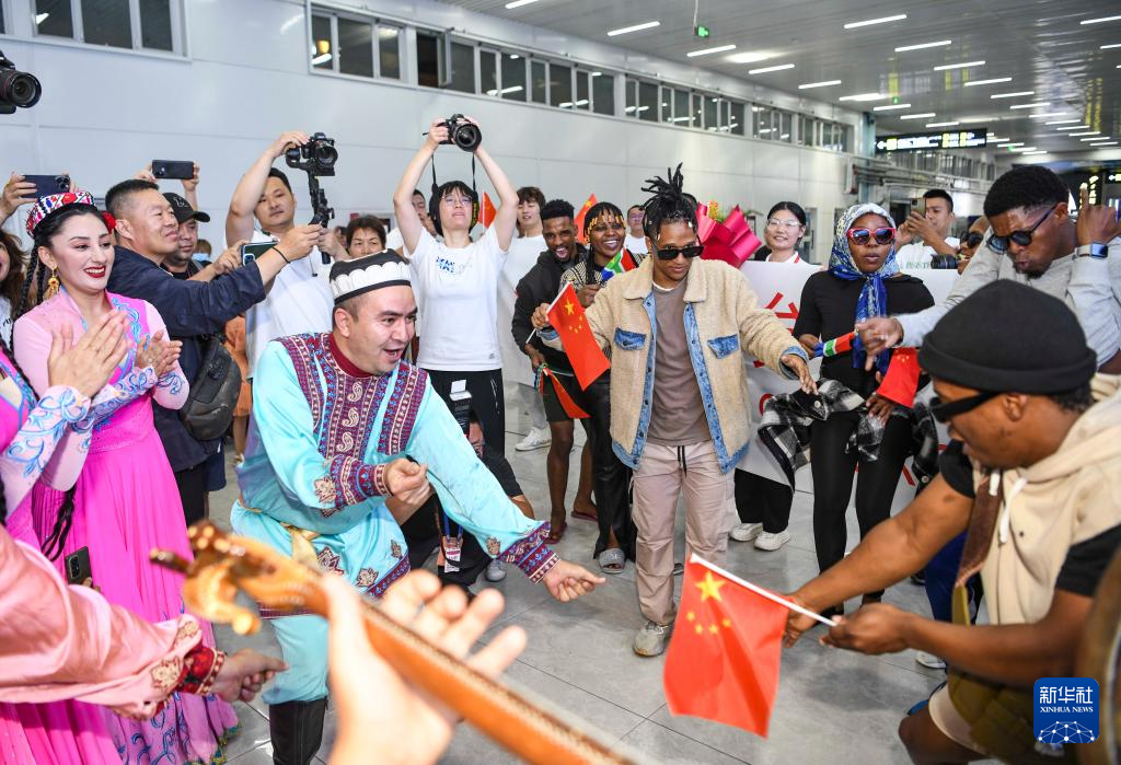新疆艺术剧院木卡姆艺术团的演员在乌鲁木齐地窝堡国际机场盛情起舞,欢迎抵达的南非舞蹈演员(7月24日摄)。