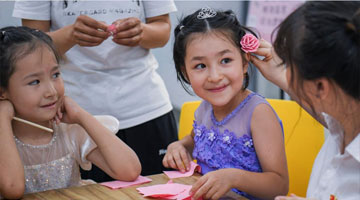 7月31日,在第31届全国图书交易博览会上,小读者在体验互动游戏。