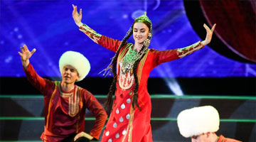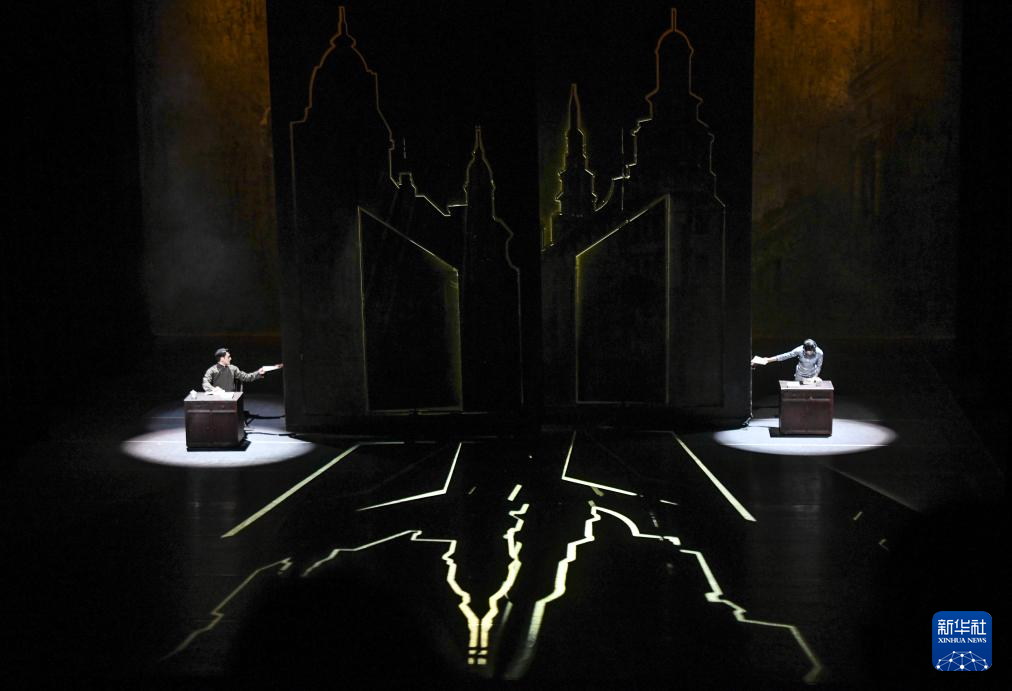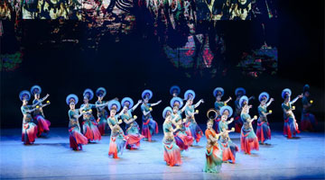 8月2日,在新疆艺术剧院木卡姆艺术团剧场,演员在表演舞剧《秀水泱泱》。