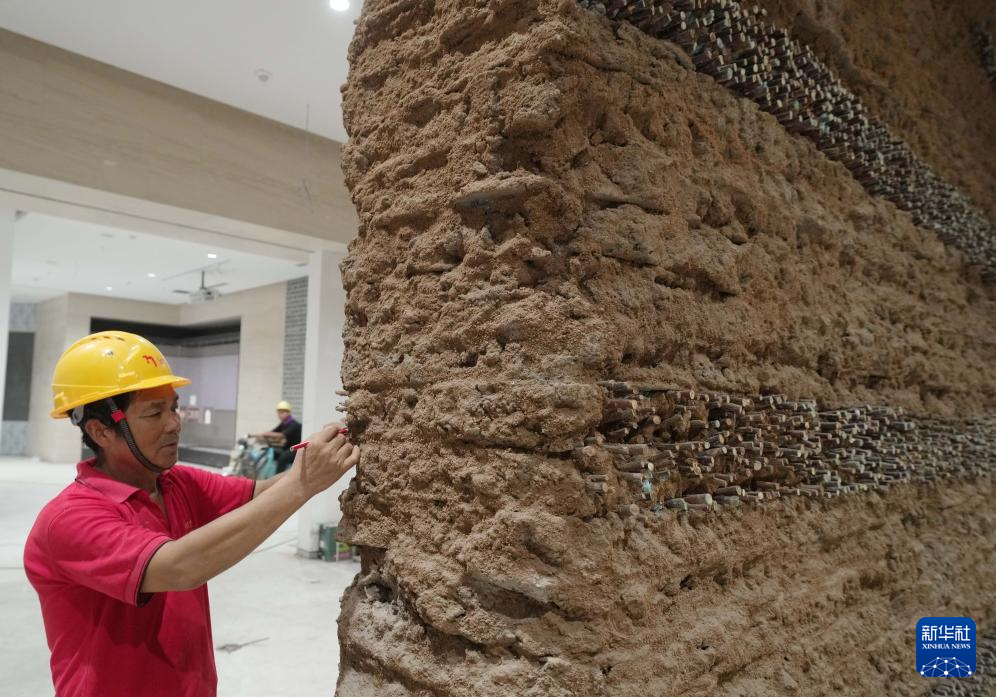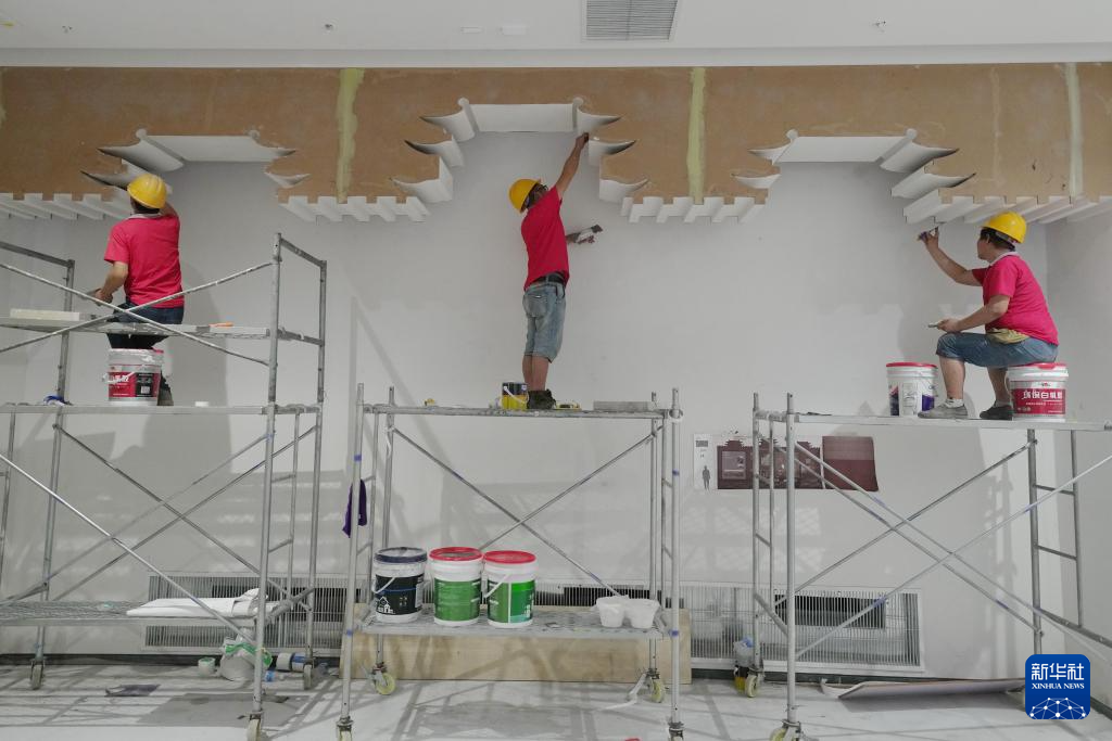 8月4日,工人在山海关中国长城博物馆进行内部装修施工。