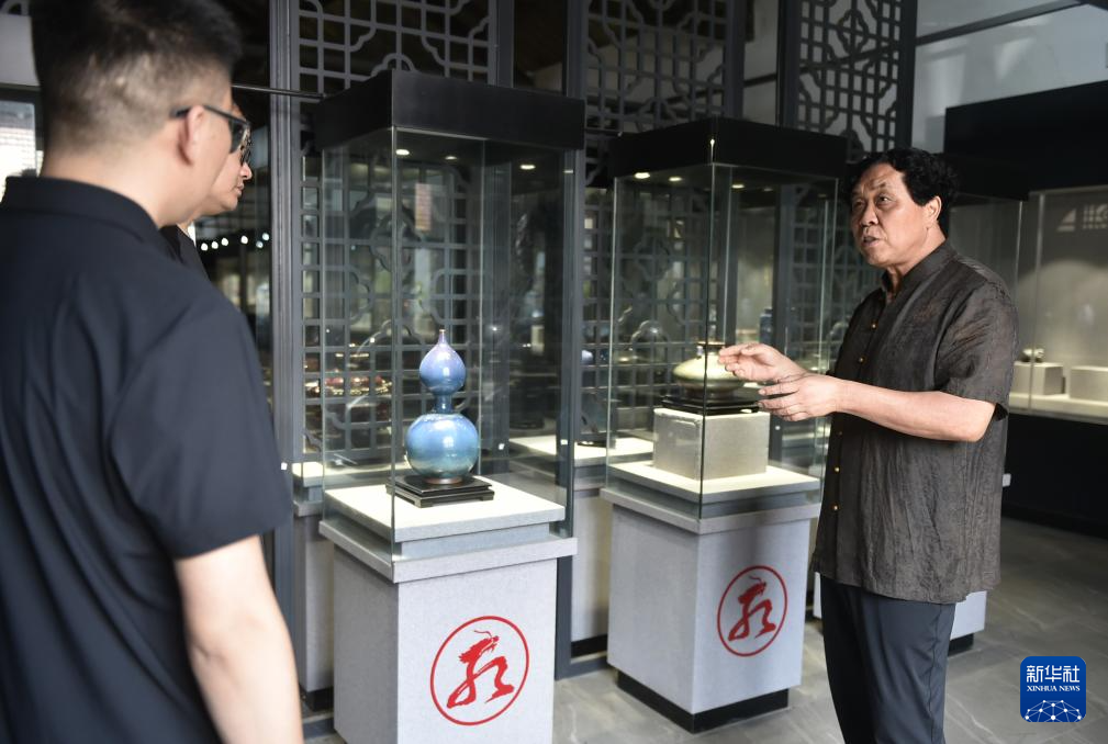8月3日,中国工艺美术大师、国家级非遗项目“钧瓷烧制技艺”代表性传承人孔相卿(右)在孔家钧窑的展厅里向来访者介绍钧瓷作品。