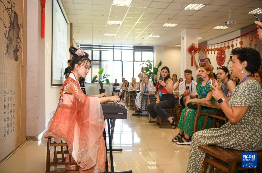 在新疆图书馆,乌鲁木齐古筝爱好者为国外歌舞团演员演奏《渔舟唱晚》(7月23日摄)。新华社记者 胡虎虎 摄