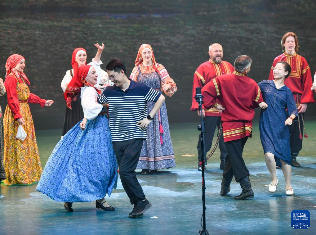 在乌鲁木齐晚报剧院,俄罗斯萨拉托夫州曙光歌舞团的演员们邀请现场观众同台共舞(7月22日摄)。新华社记者 胡虎虎 摄