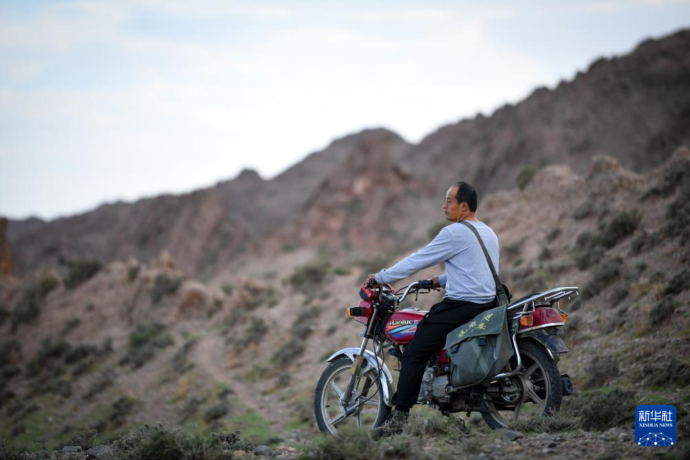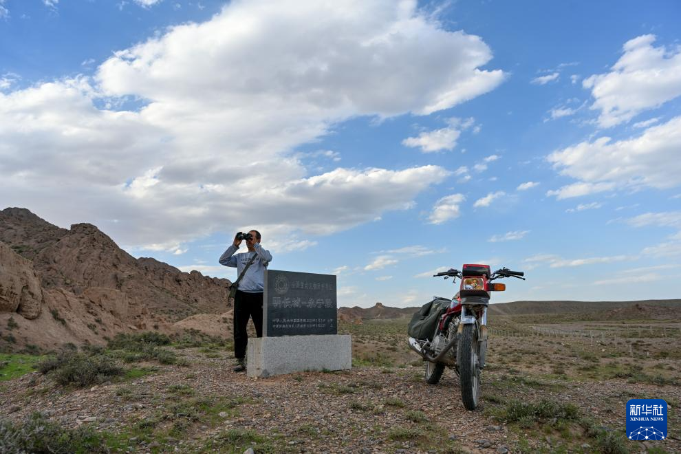 8月20日,董海宁骑摩托车巡查贺兰山沿线的明长城永宁段,利用望远镜观察远处长城情况。