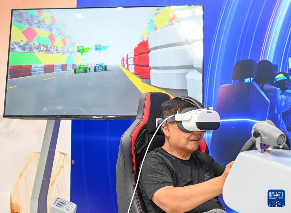 9月6日,观众在服贸会文旅服务专题展区体验VR游戏。