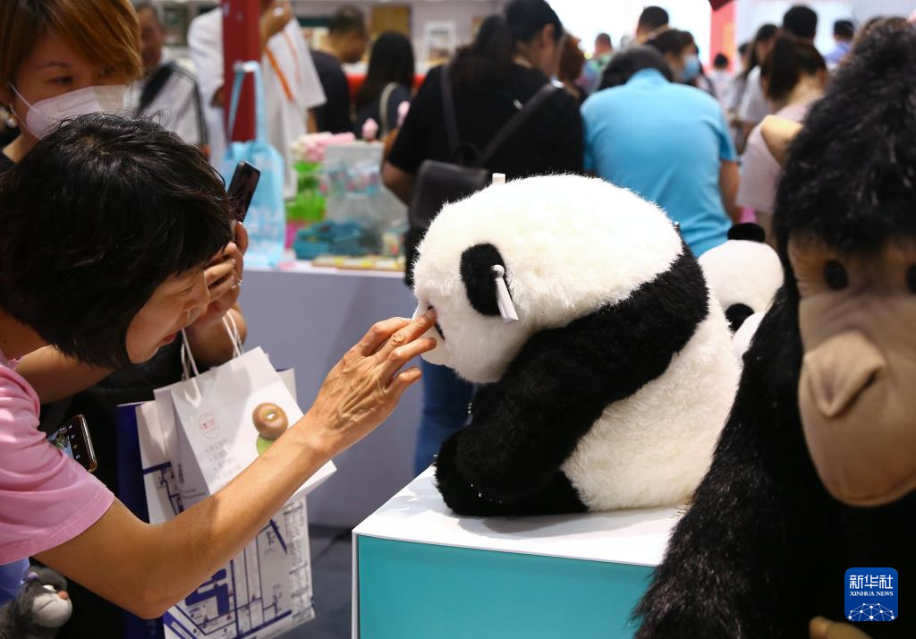 9月6日,参观者在服贸会文旅服务专题展区观看北京动物园展台展出的一款大熊猫玩偶。