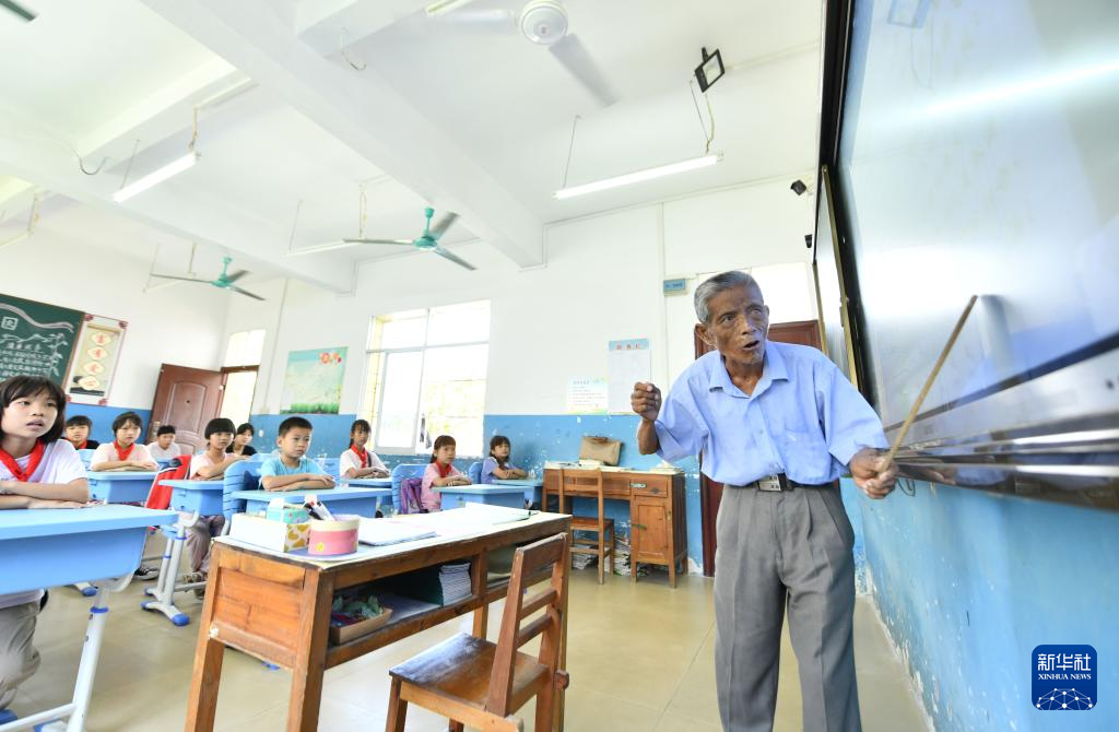 在梧州市长洲区长洲镇泗洲小学,陈明仲在教孩子们唱下俚歌(9月5日摄)。