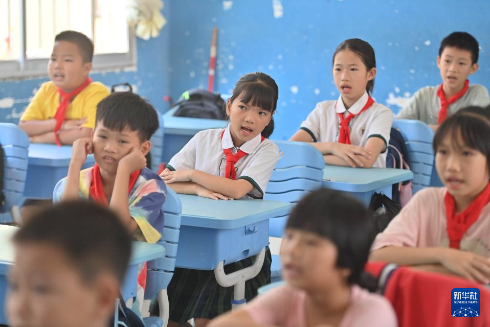 在梧州市长洲区长洲镇泗洲小学,孩子们在跟着陈明仲学唱下俚歌(9月5日摄)。