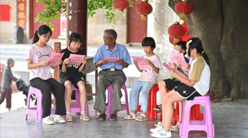 9月8日,在陕西宝鸡市西府里文化艺术村,中国工艺美术大师、陕西省非物质文化遗产社火脸谱绘制技艺代表性传承人李继友在绘制马勺脸谱。