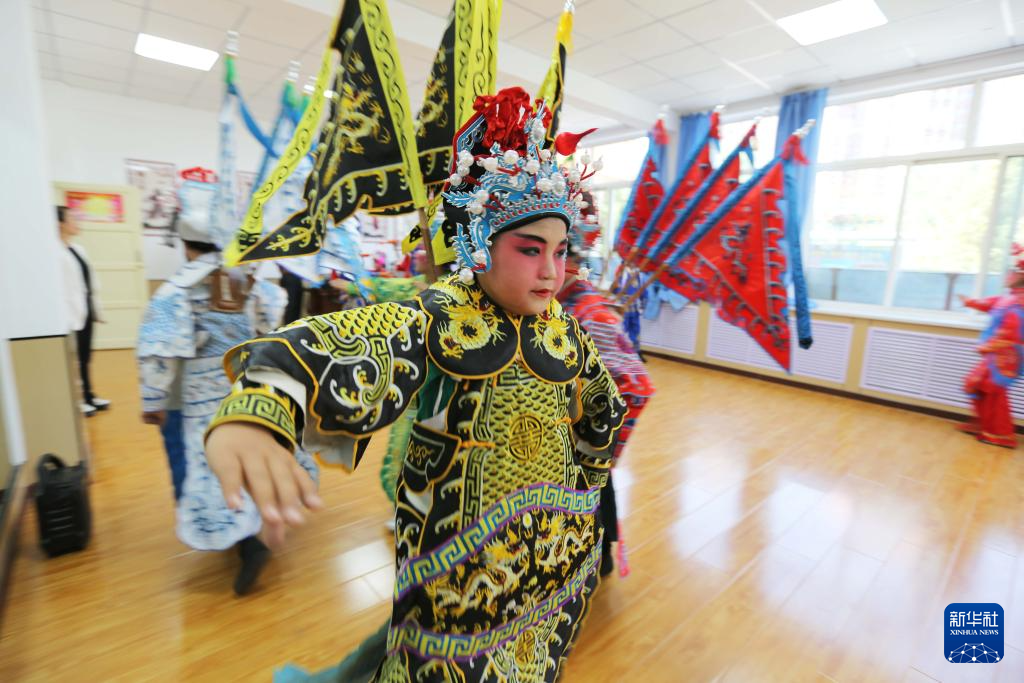 9月13日,在甘肃省定西市安定区福台小学,戏曲社团的学生们在排练《秦腔联唱》。