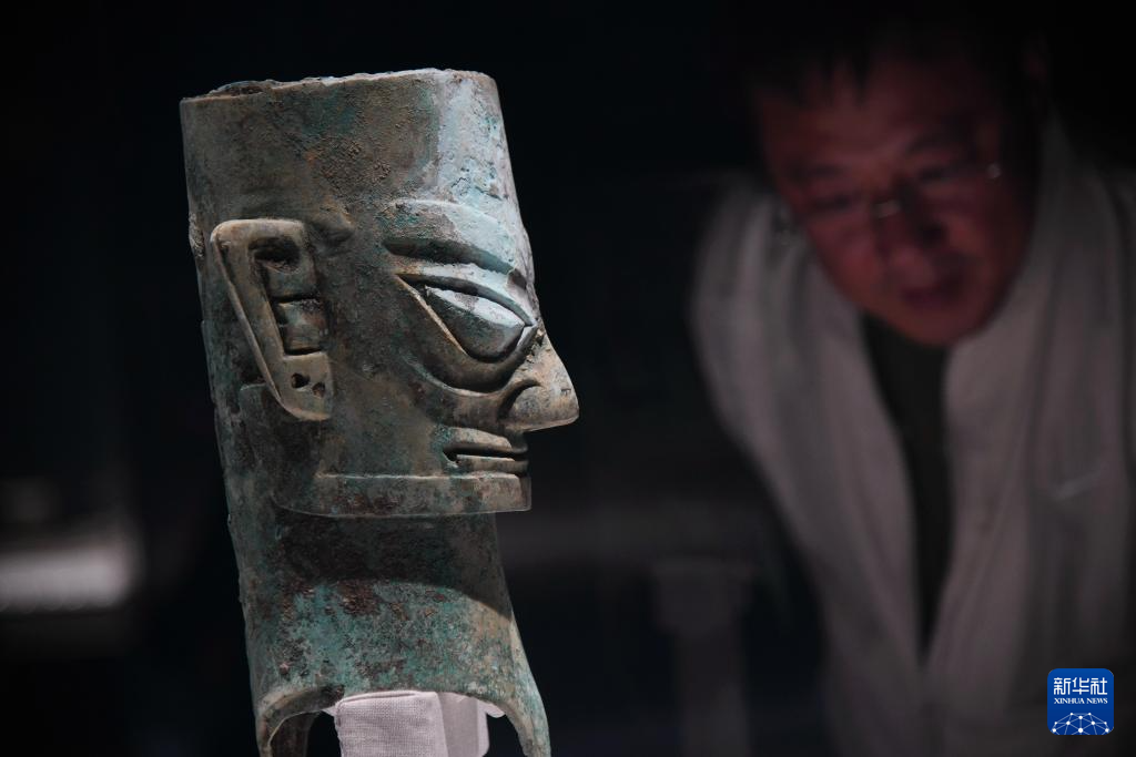 10月25日,观众在秦始皇帝陵博物院观看四川省文物考古研究院馆藏文物铜人头像。