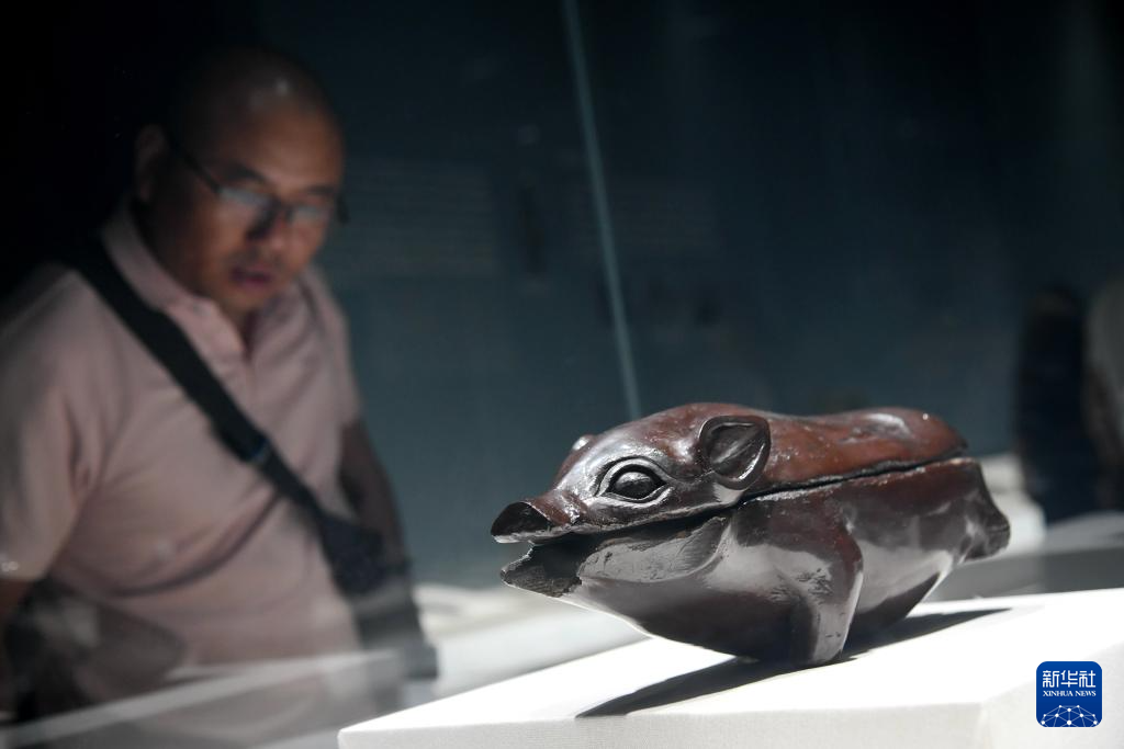 10月25日,观众在秦始皇帝陵博物院观看荆州博物馆馆藏文物猪形漆盒。