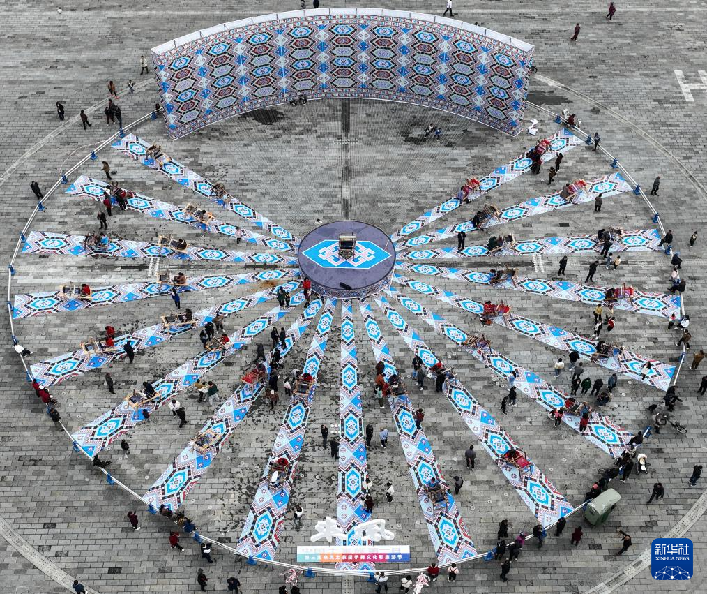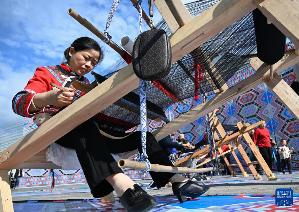 当日,数十名织锦女工在湖北省来凤县龙凤文化中心广场现场进行“西兰卡普”制作,普及非遗文化。