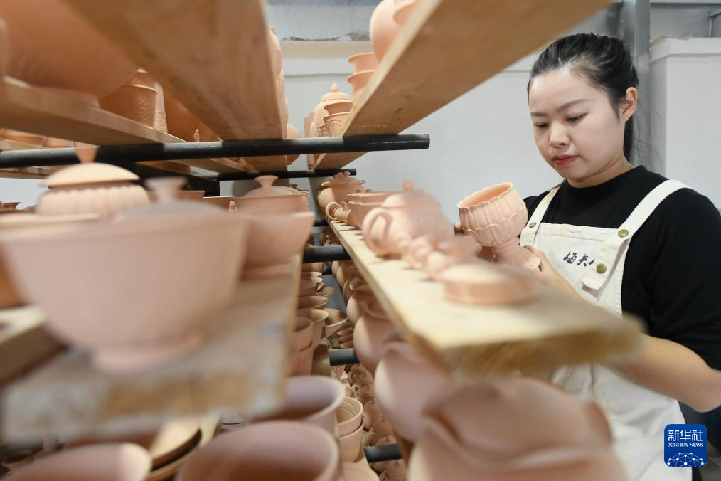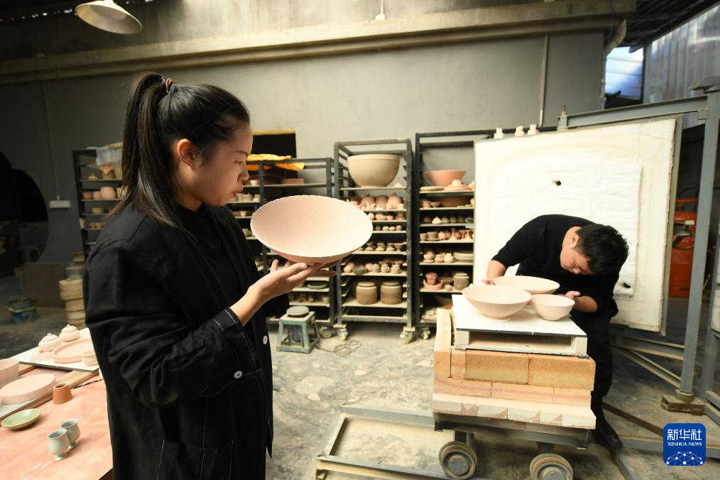 10月31日,在“梅夫人”工作室,季资美查看等待上釉的莲瓣纹香炉。