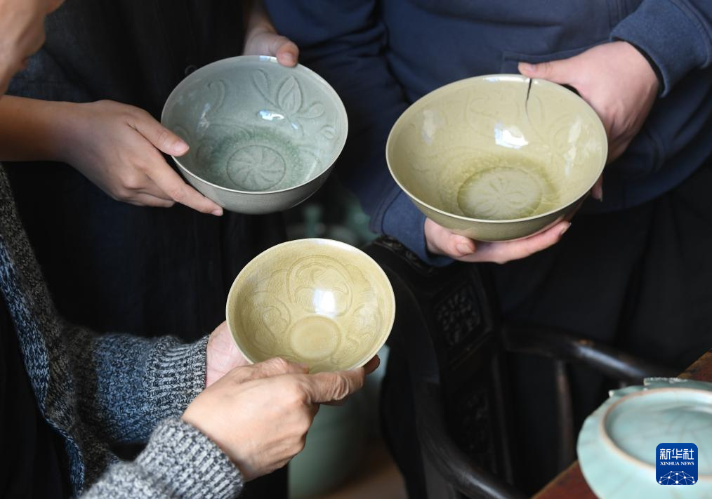 10月31日,在陶瓷文化学者蔡剑青的家中,季双俊和季资美拿着他们试做的刻划花碗和北宋龙泉窑的碗(下)做比较。