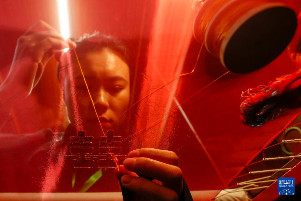 11月10日,参展人陈戴苗在第六届中国非物质文化遗产传统技艺大展上展示“金银彩绣”非遗传统技艺。