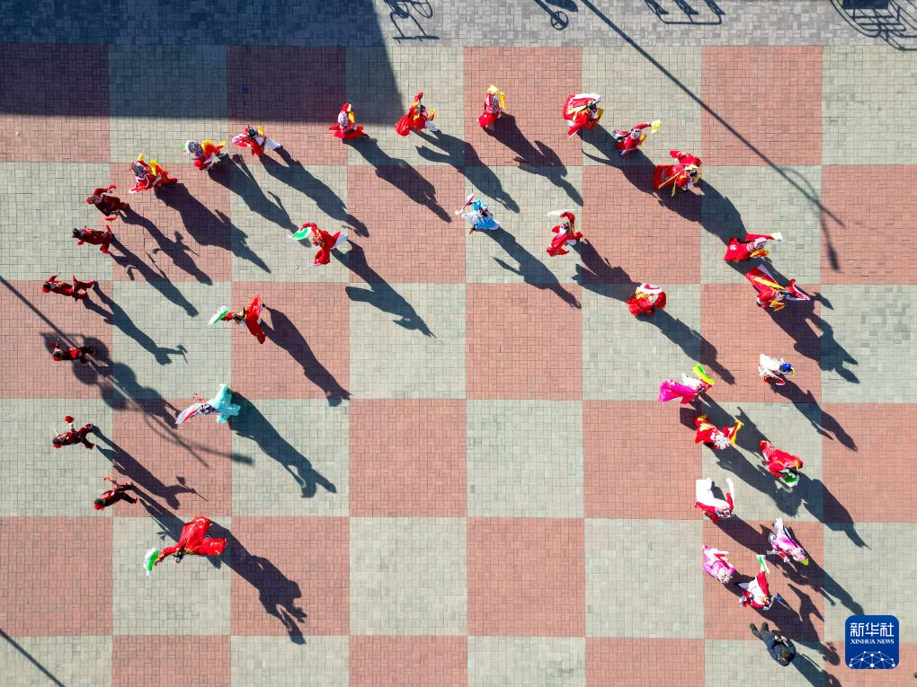 河北省滦州市葛庄村地秧歌队队员在村广场上表演(11月17日摄,无人机照片)。