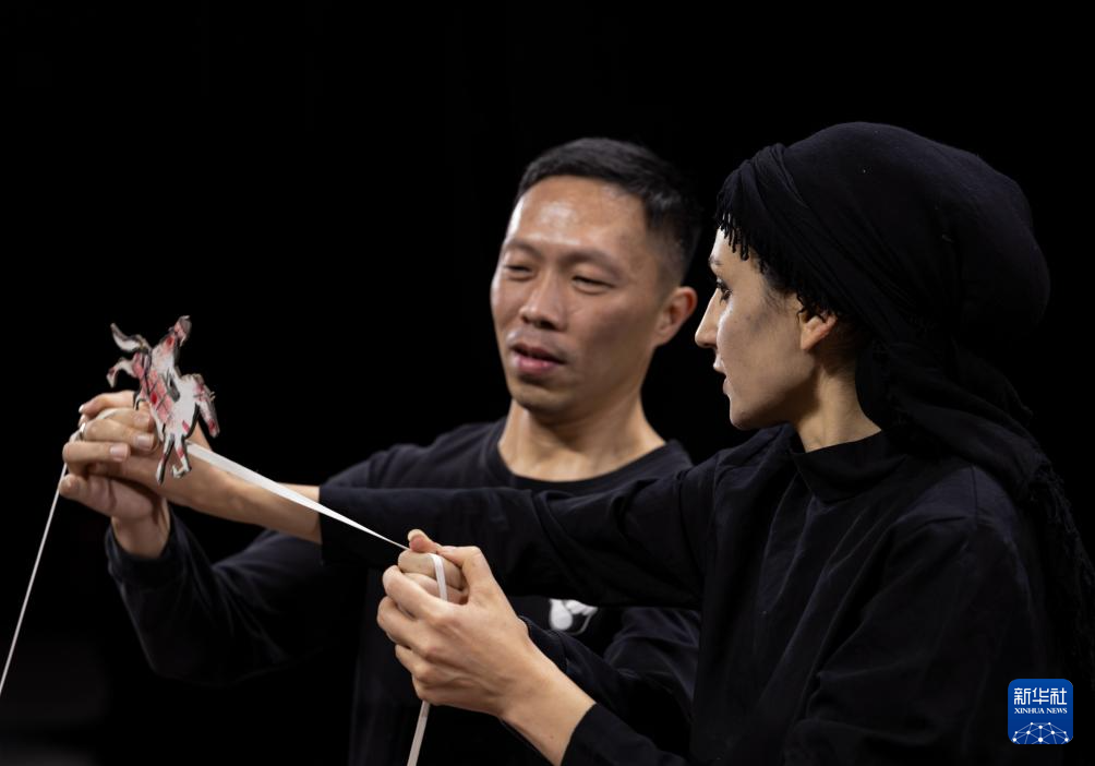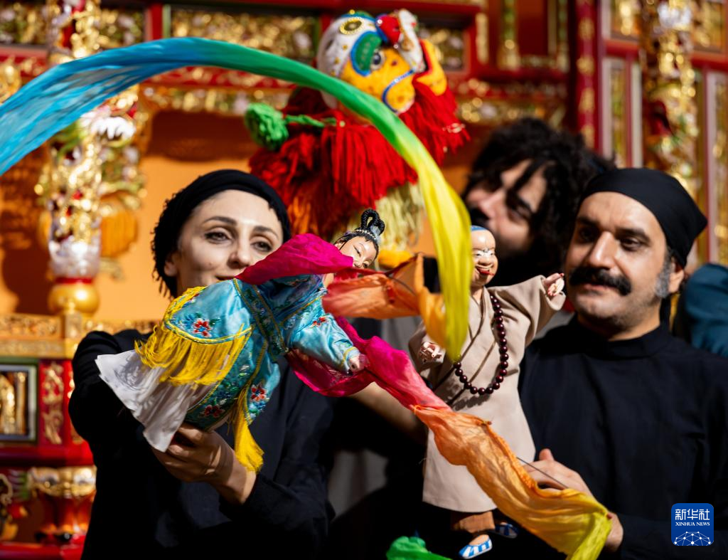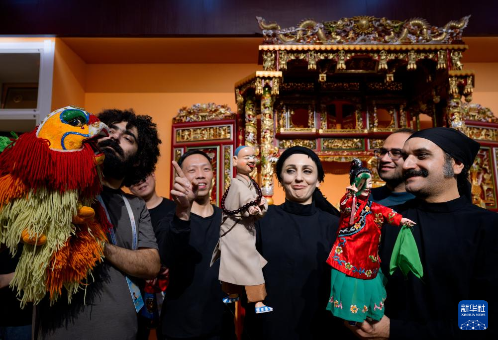 在福建泉州晋江市掌中木偶艺术保护传承中心,法希玛·巴罗奇与晋江市掌中木偶艺术保护传承中心演出队队长、市级非遗传承人陈代宫一见如故,两名中外艺术家台上台下交流互鉴,相互学习表演技艺。