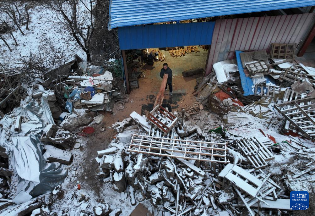 12月12日,李明军在院子里整理木材(无人机照片)。