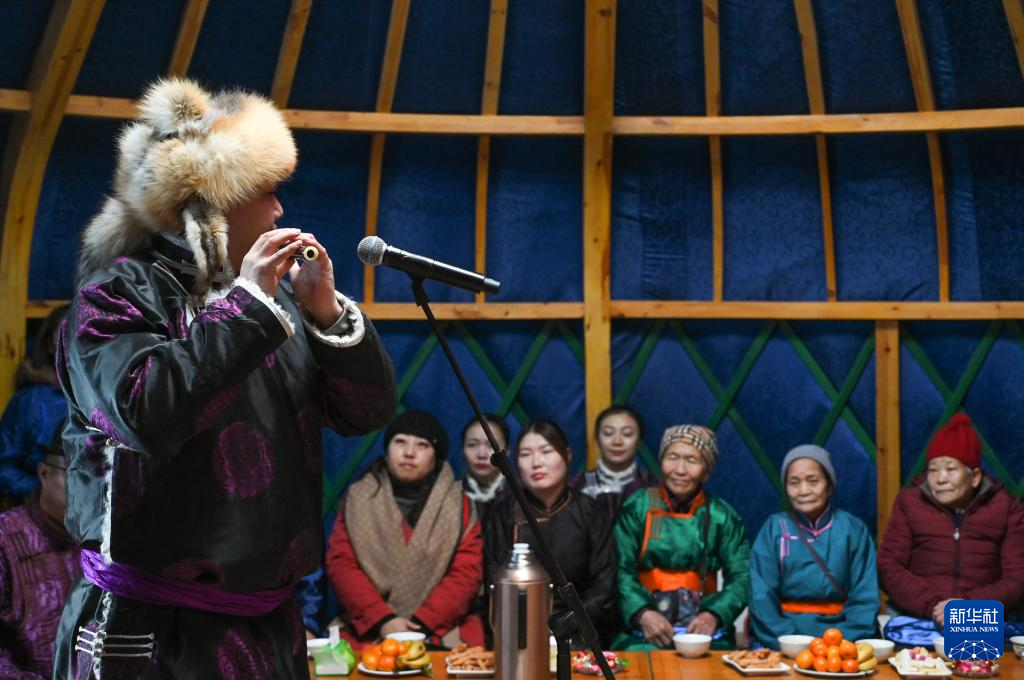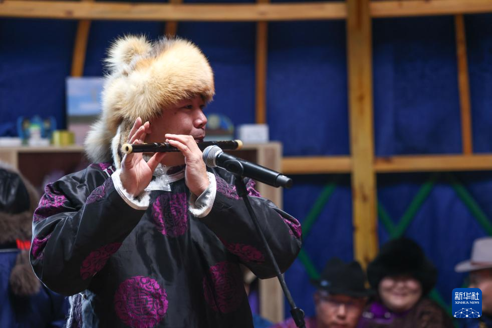 12月21日,乌兰牧骑队员在阿其图乌拉苏木进行笛子吹奏表演。
