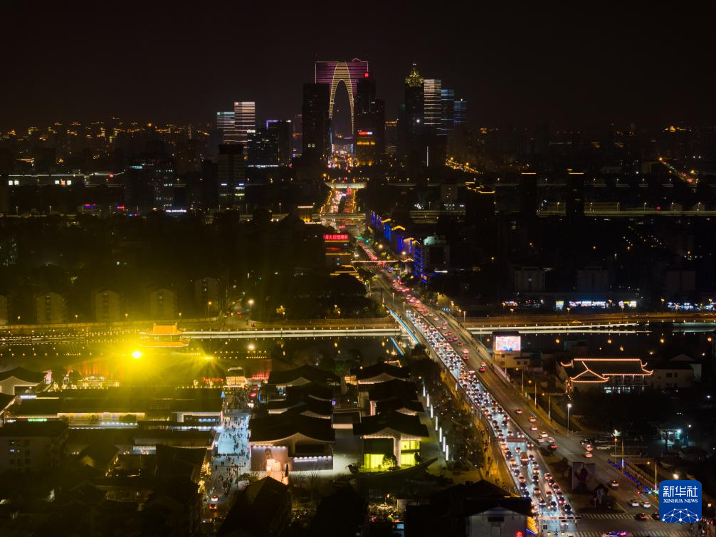 12月24日拍摄的江苏省苏州市相门古城墙灯光秀及城市夜景(无人机照片)。
