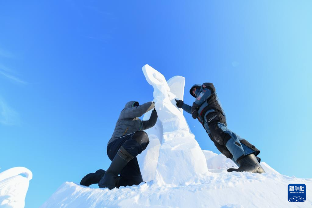 1月8日,参赛选手在进行雪雕创作。