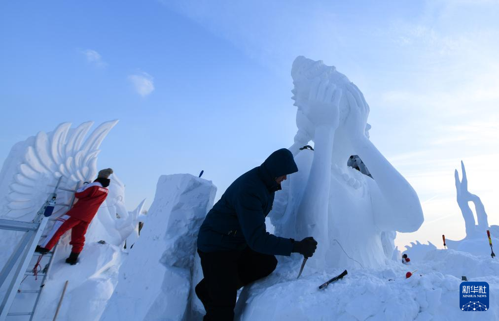 1月8日,选手在太阳岛雪博会园区内制作雪雕。
