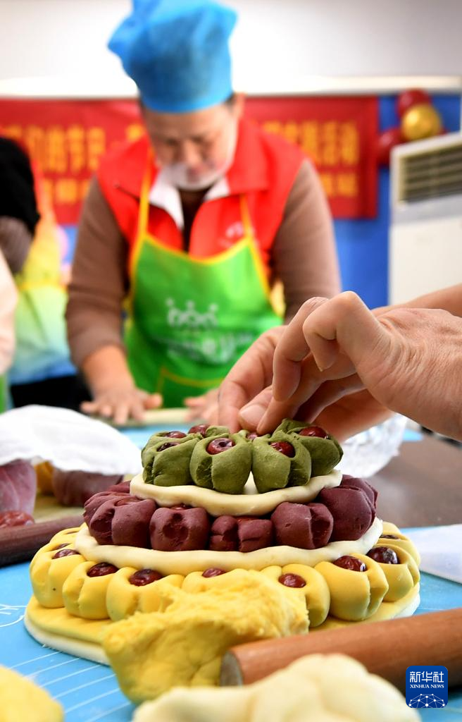 1月15日,在山东省青岛市市南区湛山街道仰口路社区,居民展示制作的寿桃花馍。