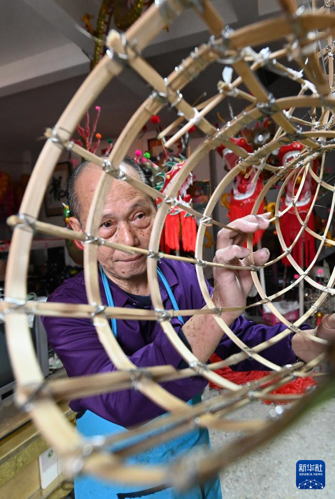 1月16日,在广西宾阳县宾州镇三联街,邹玉特在扎制炮龙。