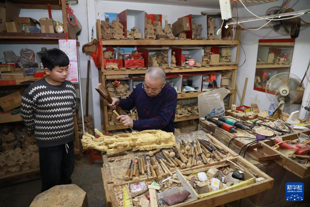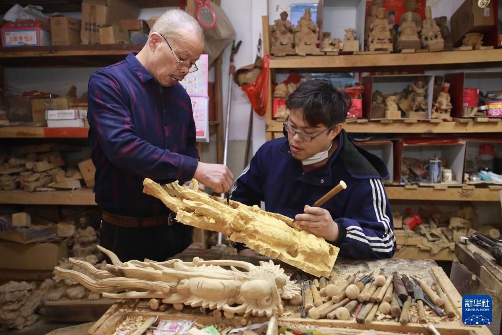 1月27日,在晋江市东石镇潘山村,潘山庙宇木雕代表性传承人郑鲍淑(左)指导儿子郑振博雕刻龙头。