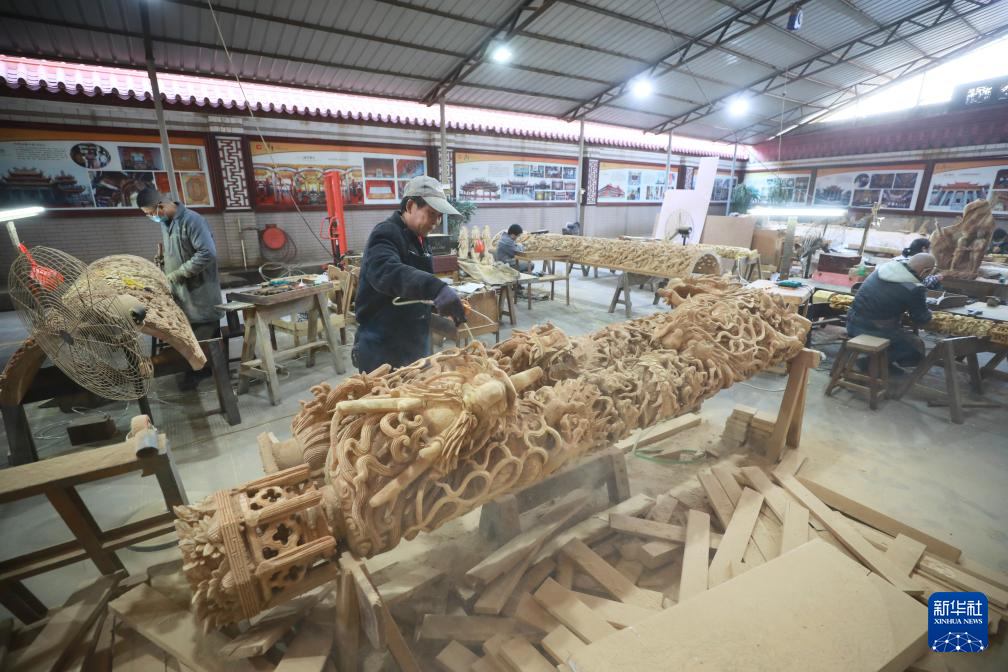 龙年春节将至,在福建省晋江市东石镇潘山村的木雕厂内,工人们加紧赶制出货订单,一件件精美的龙柱、龙头等庙宇木雕产品在工人们的精雕细琢中诞生。潘山庙宇木雕以庙宇雕刻为表现方式,历史悠久,工艺精湛,产品主要在海峡两岸销售,同时销往新加坡、印度尼西亚、菲律宾等东南亚国家。2021年,以潘山庙宇木雕为代表的泉州木雕成功入选第五批国家级非遗名录。