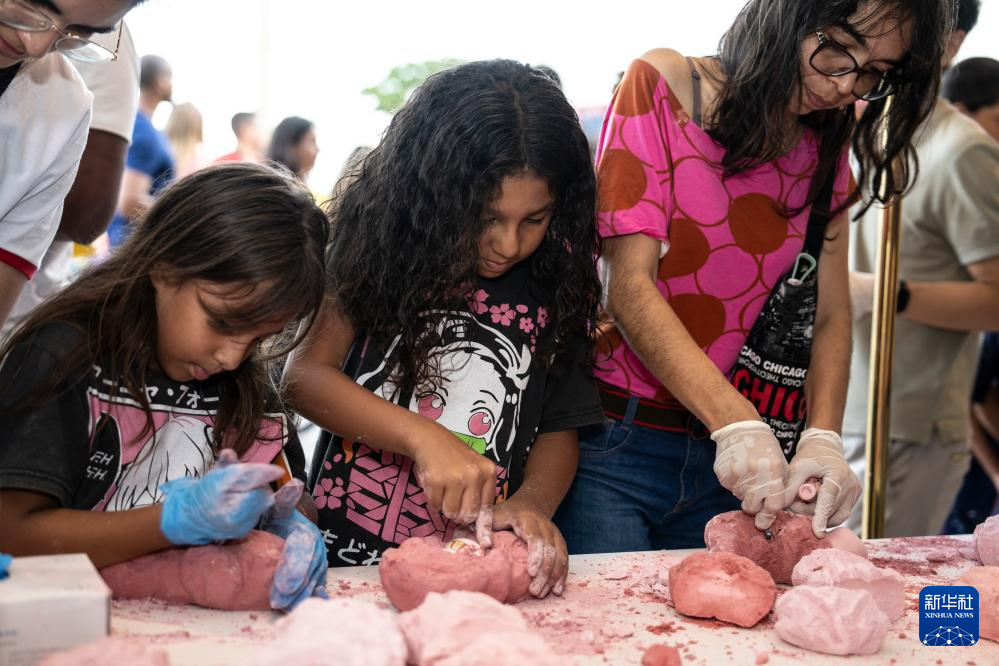 2月3日,在巴西累西腓,人们在中国春节庆祝活动上体验开考古盲盒。