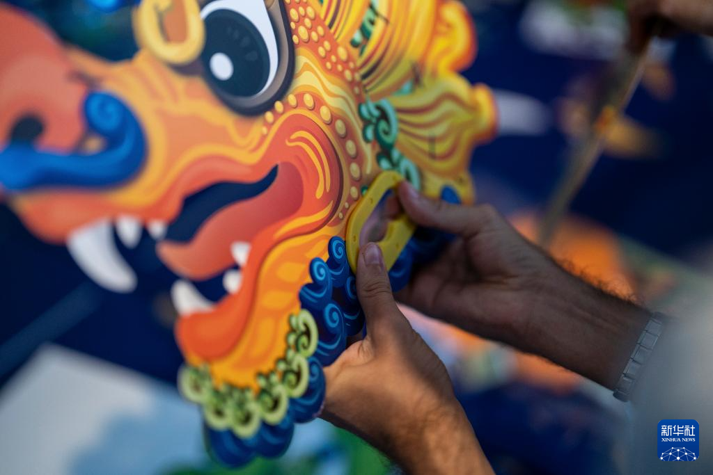 2月3日,在巴西累西腓,一名男子在中国春节庆祝活动上制作龙头。