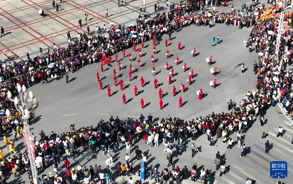 2月18日,人们观看贵州省龙里县民俗踩街活动(无人机照片)。