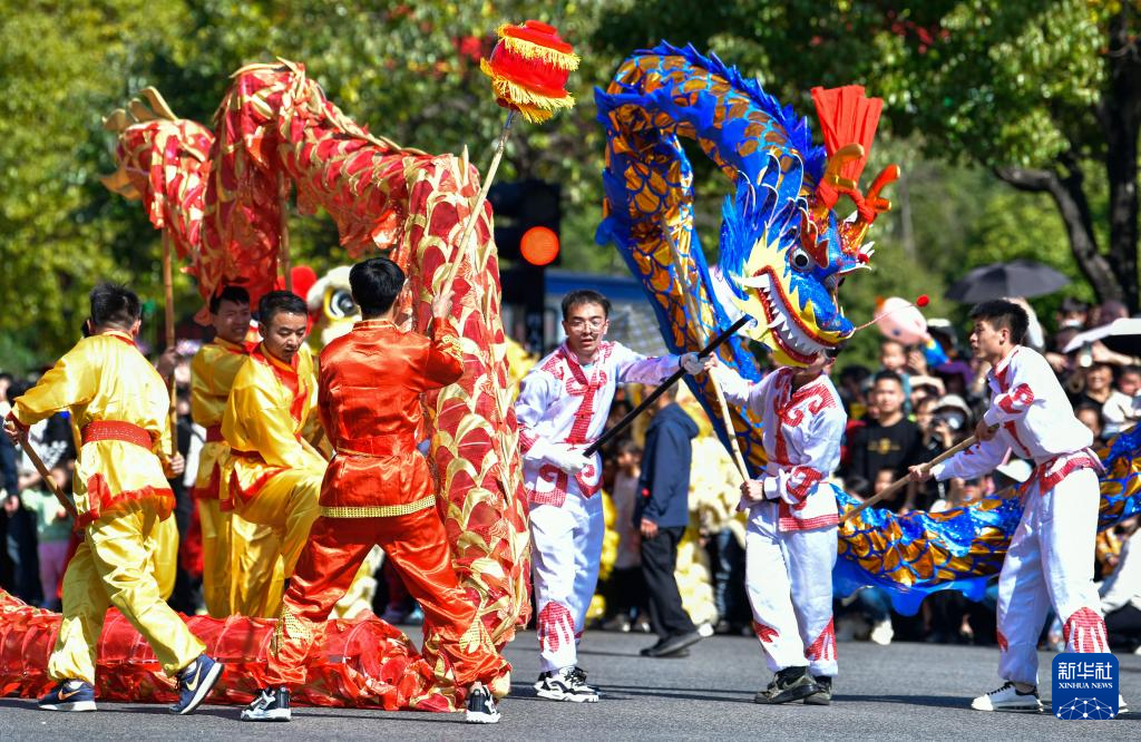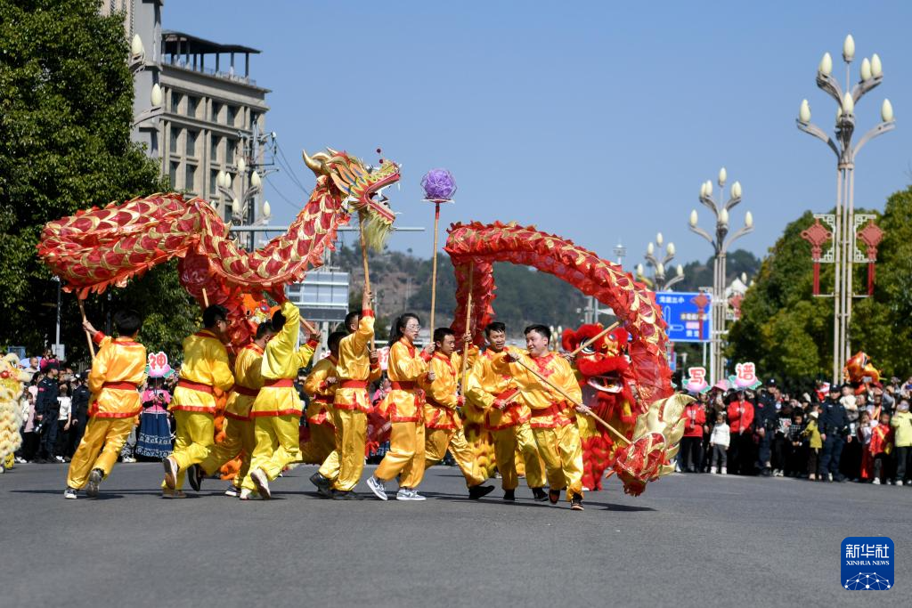当日是正月初九,贵州省黔南布依族苗族自治州龙里县举办主题为“金龙贺岁·欢欢喜喜过龙年”的民俗踩街活动。