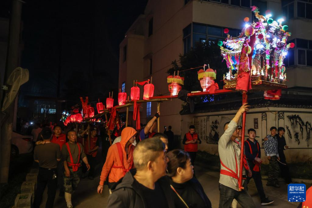 2月19日,在澧浦镇里新村,村民们抬着长长的传统板凳龙在村落中穿行。