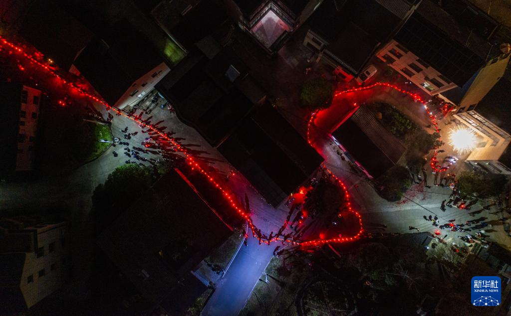 2月19日,在澧浦镇里新村,村民们抬着长长的传统板凳龙在村落中穿行(无人机照片)。